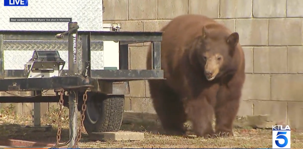 Erin Myers of KTLA5 was delivering a live report from the San Gabriel Valley community Sunday morning, explaining that residents of the home on Oakglade Drive had set up a trap to try to catch the bear, who’d been living underneath the house.