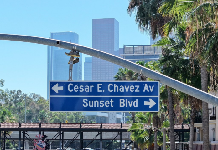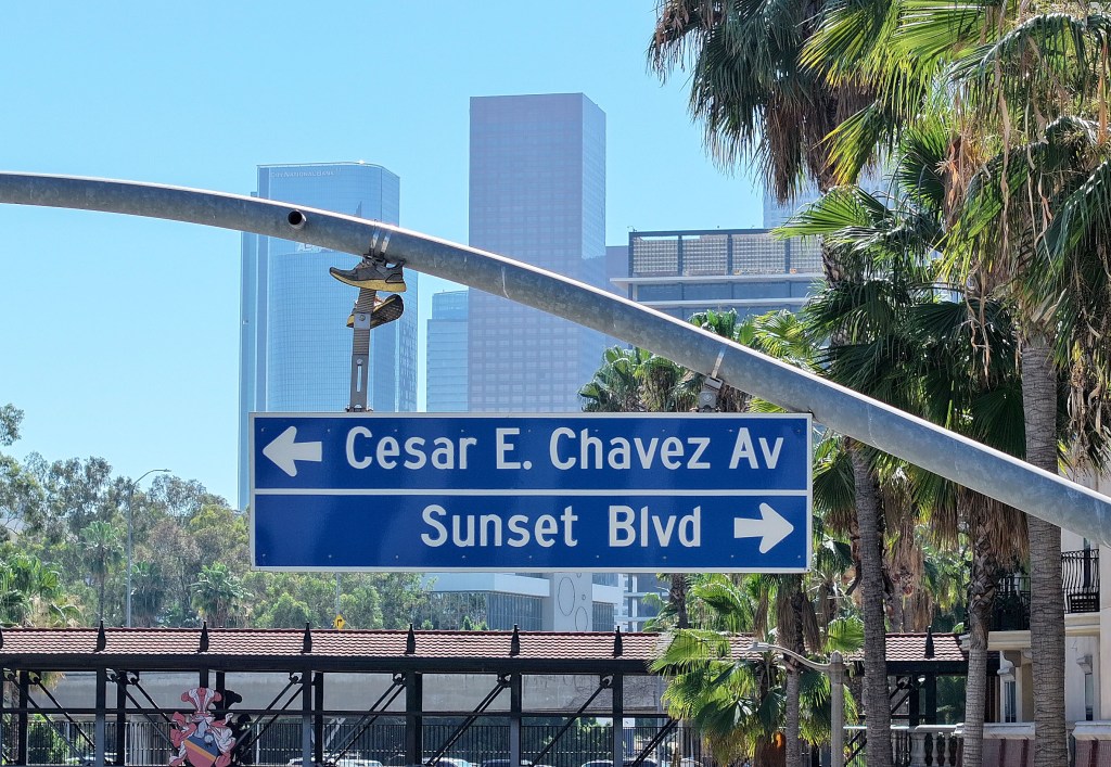 “César Chávez Avenue needs to be replaced,” he told a group of reporters, as the bustle and din of traffic echoed among the multi-family, multi-story apartments all around, near the Figueroa Street intersection. “There are conversations within the community, one that we are spearheading,” he added, that would change it to “Dolores Huerta Avenue.”