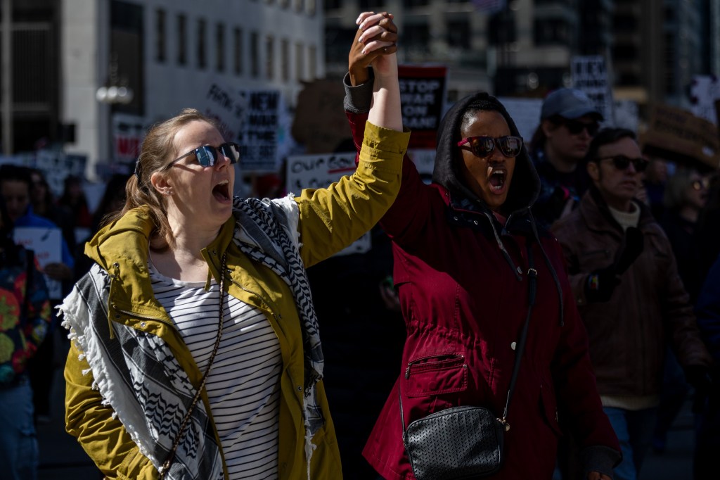 Protesters gathered in the Loop’s Daley Plaza and came wielding signs with references to abortion, immigration, the war in Iran and women’s rights.