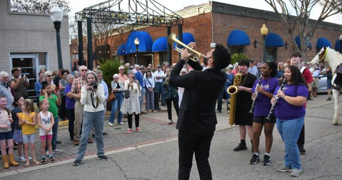 Before the parade, jazz trumpeter Riley Mulherkar, the festival’s artistic director, huddled on a street corner with a quartet of students from South Aiken High School, teaching them how to play “Second Line,” a tune featured in New Orleans street parades.