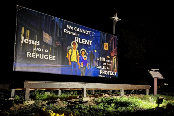 In the scene’s background is a silhouetted figure, said to represent “an ICE agent who is targeting the holy family and our neighbors in everyday places.”
