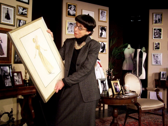 Once Head arrives in the theater (“fashionably” late), she recaps her life, work, triumphs, furies and regrets on a stage surrounded by some of her most famous costumes, a few of her Oscars and photos of the Hollywood stars she designed for over the years, including Mae West, Grace Kelly, Dorothy Lamour, Bette Davis, Barbara Stanwyick, Hedy Lamarr and more.